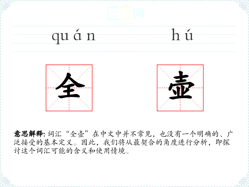 由于“全壶”不是一个标准词汇,我们可以推测它可能是由“全”和“壶”两个字组合而成的。在这里,“全”通常表示完整、全部的意思,而“壶”则指一种容器,通常用于装液体,如茶、水等。因此,“全壶”可能指的是一壶完整的液体,或者比喻性地指全部的内容或资源。