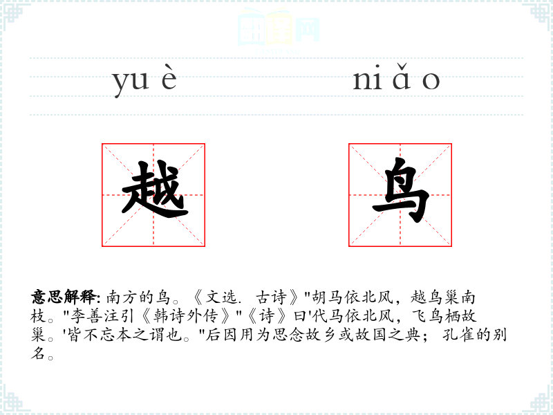 ,飞鸟栖故巢。'皆不忘本之谓也。"后因用为思念故乡或故国之典; 孔雀的别名。