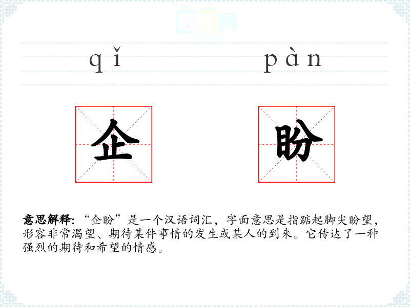 “企盼”一词源于汉语,其中“企”字古已有之,意为踮起脚尖,而“盼”字则表示看或期待。两者结合,形成了表达强烈期待的词汇。