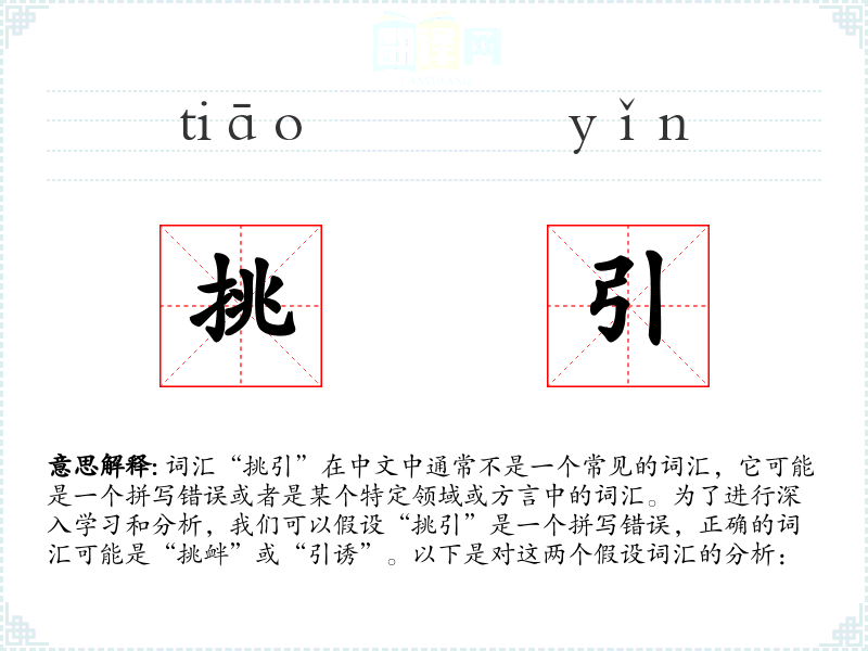 由于“挑引”不是一个明确的词汇,上述分析基于假设的正确词汇“挑衅”和“引诱”。如果“挑引”确实是一个特定词汇,请提供更多上下文以便进行准确分析。