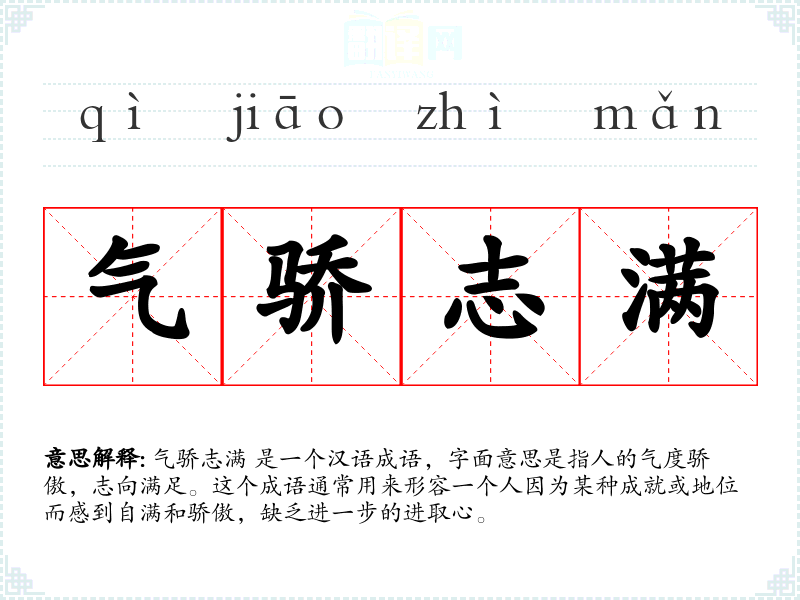 气骄志满 是一个汉语成语,字面意思是指人的气度骄傲,志向满足。这个成语通常用来形容一个人因为某种成就或地位而感到自满和骄傲,缺乏进一步的进取心。