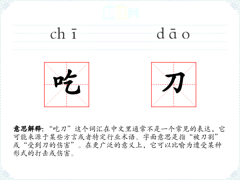 “吃刀”这个词汇在中文里通常不是一个常见的表达,它可能来源于某些方言或者特定行业术语。字面意思是指“被刀割”或“受到刀的伤害”。在更广泛的意义上,它可以比喻为遭受某种形式的打击或伤害。