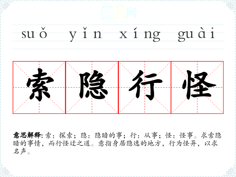 索:探索;隐:隐暗的事;行:从事;怪:怪事。求索隐暗的事情,而行怪迂之道。意指身居隐逸的地方,行为怪异,以求名声。