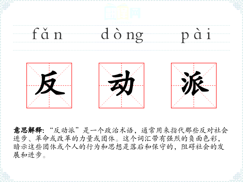 “反动派”是一个政治术语,通常用来指代那些反对社会进步、革命或改革的力量或团体。这个词汇带有强烈的负面色彩,暗示这些团体或个人的行为和思想是落后和保守的,阻碍社会的发展和进步。