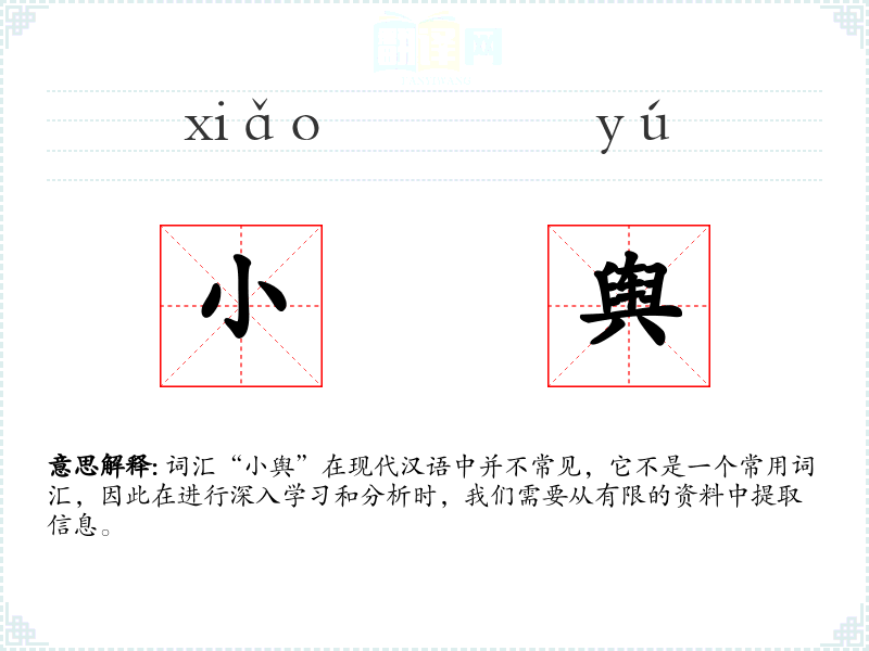 词汇“小舆”在现代汉语中并不常见,它不是一个常用词汇,因此在进行深入学*和分析时,我们需要从有限的资料中提取信息。