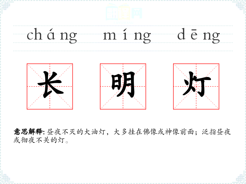昼夜不灭的大油灯,大多挂在佛像或神像前面;泛指昼夜或彻夜不关的灯。