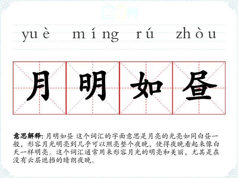 月明如昼 这个词汇的字面意思是月亮的光亮如同白昼一般,形容月光明亮到几乎可以照亮整个夜晚,使得夜晚看起来像白天一样明亮。这个词汇通常用来形容月光的明亮和美丽,尤其是在没有云层遮挡的晴朗夜晚。
