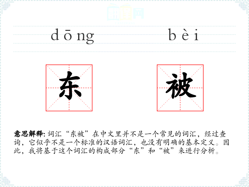 由于“东被”不是一个标准词汇,它在不同语境下的使用不明确。如果强行解释,可以理解为“东方的被子”或“被东方的”,但这并不符合常规的语言使用。