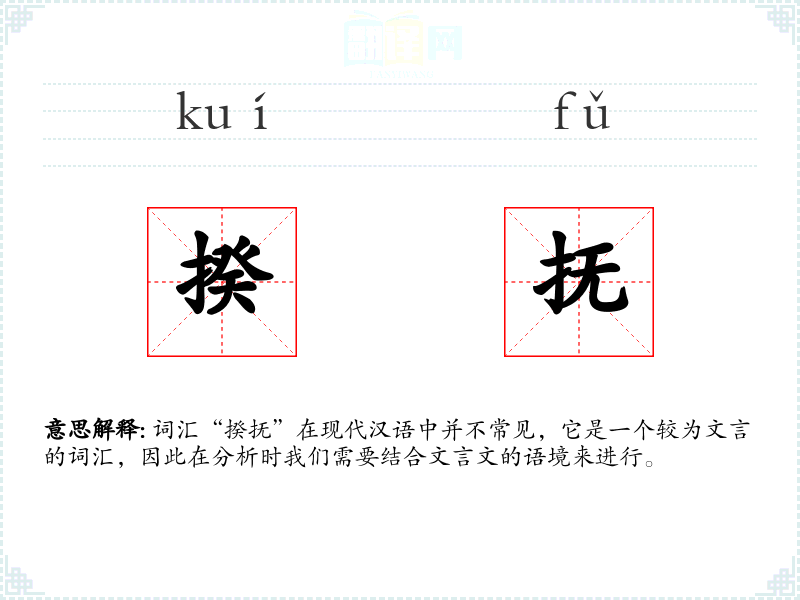 词汇“揆抚”在现代汉语中并不常见,它是一个较为文言的词汇,因此在分析时我们需要结合文言文的语境来进行。