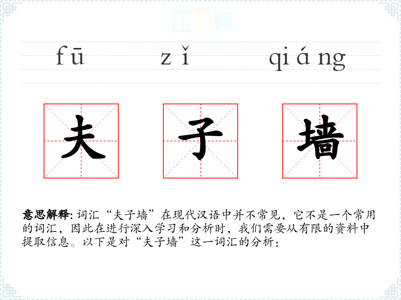 词汇“夫子墙”在现代汉语中并不常见,它不是一个常用的词汇,因此在进行深入学*和分析时,我们需要从有限的资料中提取信息。以下是对“夫子墙”这一词汇的分析: