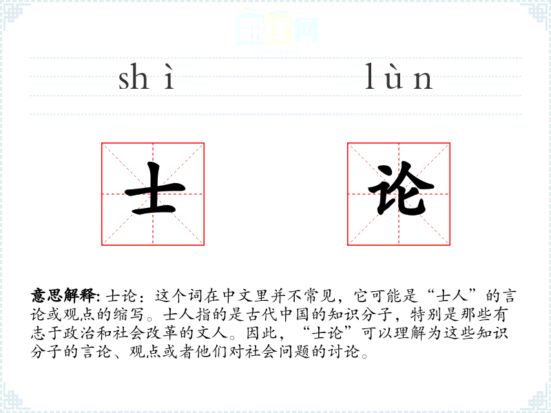 “士论”这个词可能是由“士人”和“论”两个词组合而成。在古代**,士人是社会的一个重要阶层,他们的言论和思想对社会有重要影响。随着时间的推移,这个词可能被用来特指这些人的观点和讨论。