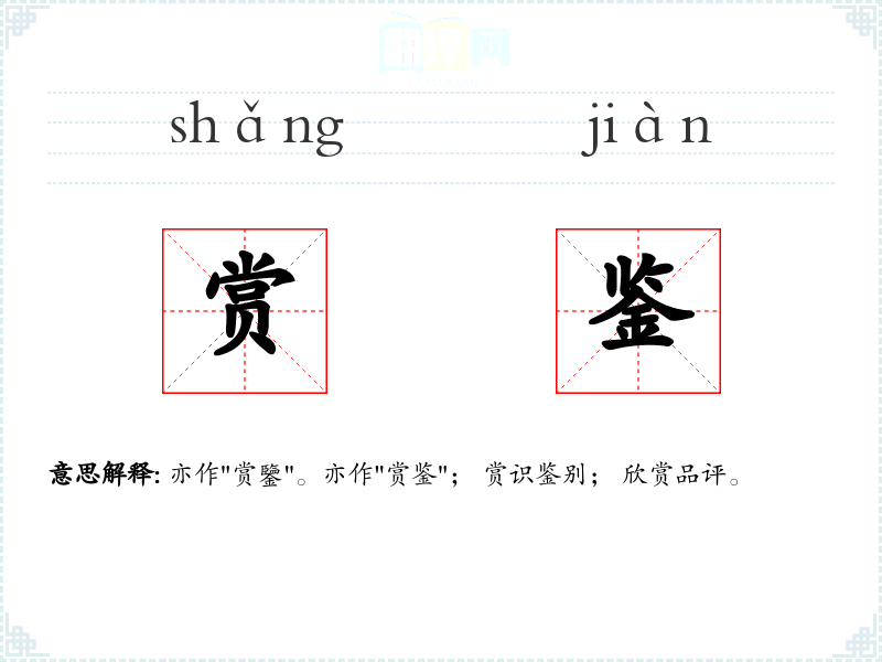 亦作"赏鑒"。亦作"赏鉴"; 赏识鉴别; 欣赏品评。
