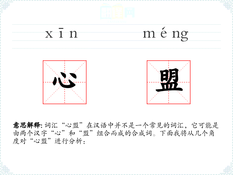 - 字面意思:心,通常指人的内心、情感或思想;盟,意味着结盟、盟约或联合。