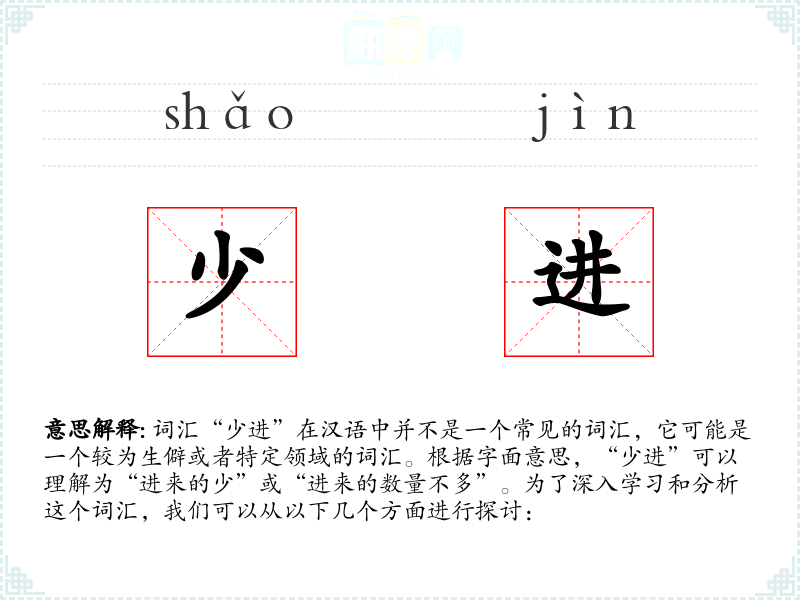 词汇“少进”在汉语中并不是一个常见的词汇,它可能是一个较为生僻或者特定领域的词汇。根据字面意思,“少进”可以理解为“进来的少”或“进来的数量不多”。为了深入学习和分析这个词汇,我们可以从以下几个方面进行探讨: