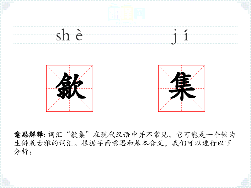 词汇“歙集”在现代汉语中并不常见,它可能是一个较为生僻或古雅的词汇。根据字面意思和基本含义,我们可以进行以下分析: