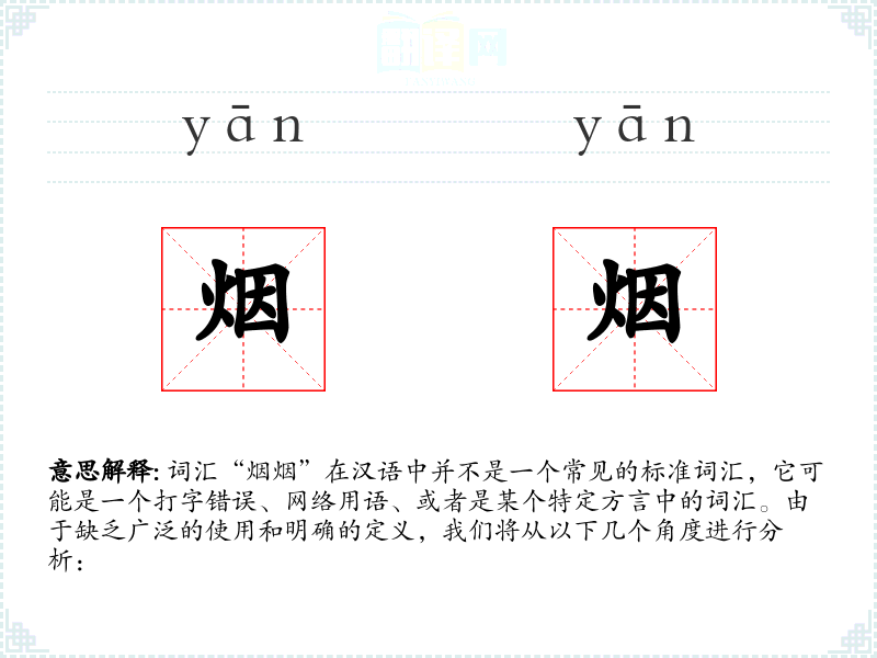 由于“烟烟”不是一个标准词汇,我们无法给出确切的基本定义。它可能是“烟”的重复,用来强调烟雾的浓密或连续不断。