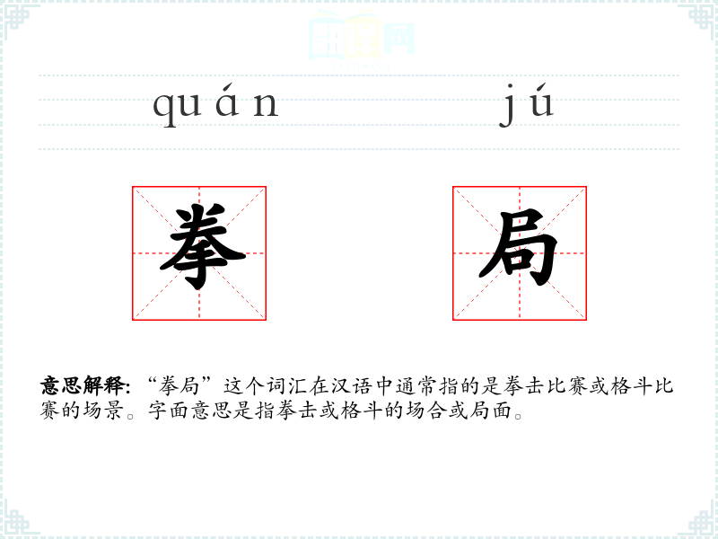 “拳局”这个词汇在汉语中通常指的是拳击比赛或格斗比赛的场景。字面意思是指拳击或格斗的场合或局面。