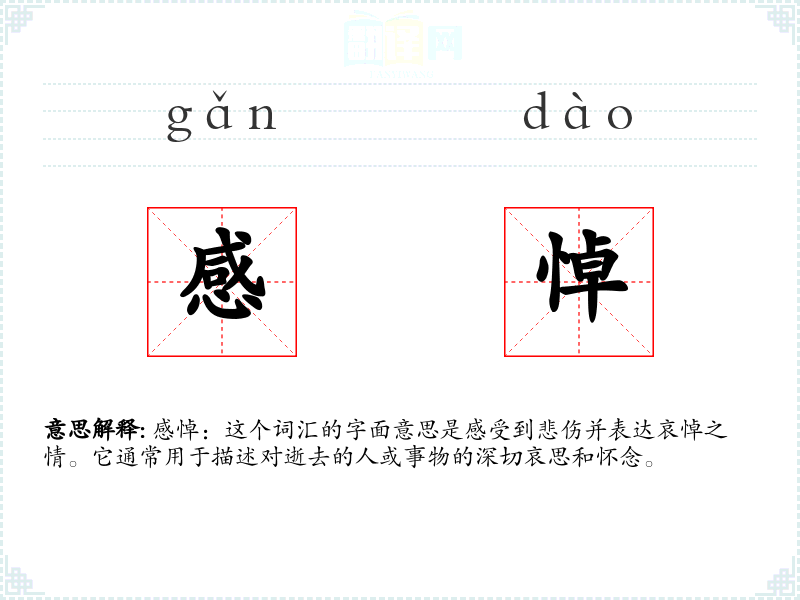 词源:“感悼”由“感”和“悼”两个字组成。“感”意为感受,“悼”意为哀悼。