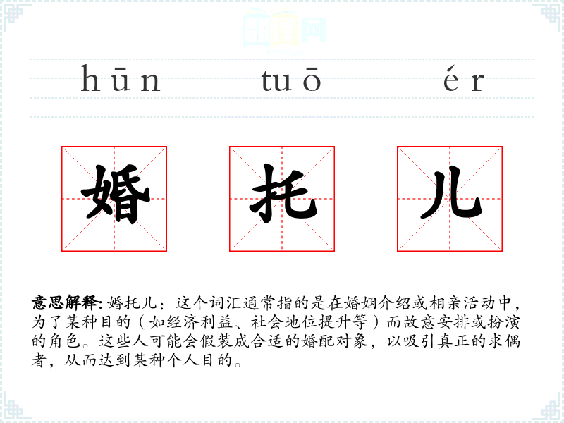 婚托儿:这个词汇通常指的是在婚姻介绍或相亲活动中,为了某种目的(如经济利益、社会地位提升等)而故意安排或扮演的角色。这些人可能会假装成合适的婚配对象,以吸引真正的求偶者,从而达到某种个人目的。