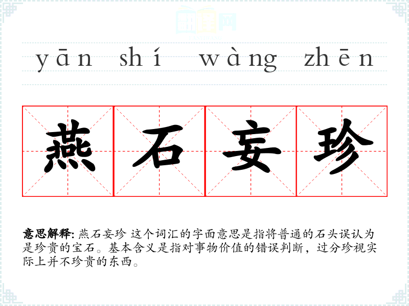 燕石妄珍 这个词汇可能源自古代的一个故事,讲述一个人误将普通的燕石当作珍贵的宝石。随着时间的推移,这个词汇被广泛用于各种语境,以表达对事物价值的错误判断。