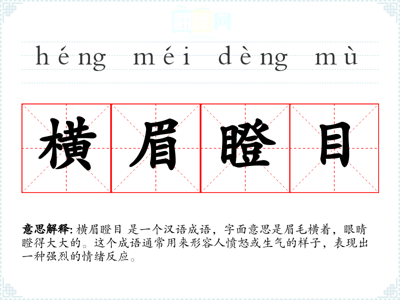 横眉瞪目 是一个汉语成语,字面意思是眉毛横着,眼睛瞪得大大的。这个成语通常用来形容人愤怒或生气的样子,表现出一种强烈的情绪反应。