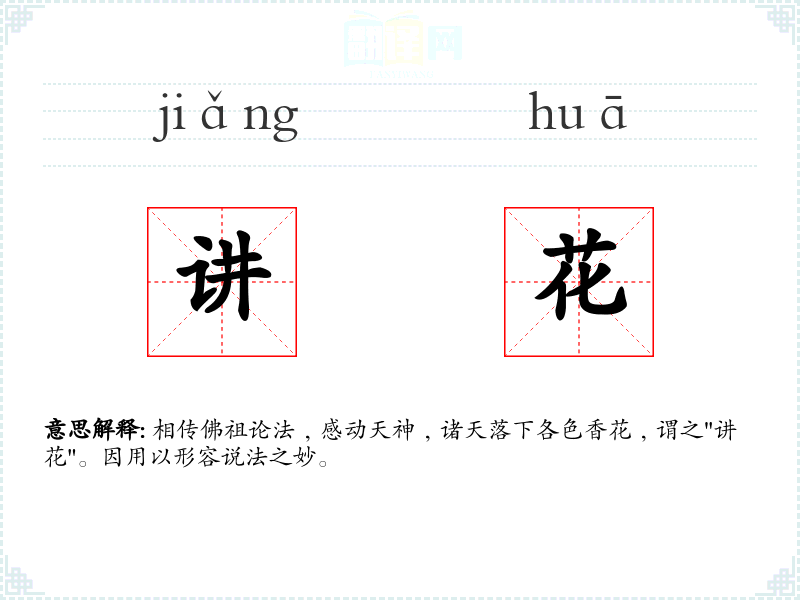 相传佛祖论法﹐感动天神﹐诸天落下各色香花﹐谓之"讲花"。因用以形容说法之妙。