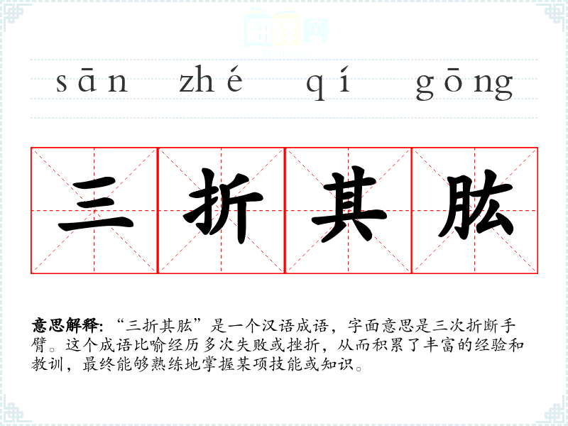 “三折其肱”是一个汉语成语,字面意思是三次折断手臂。这个成语比喻经历多次失败或挫折,从而积累了丰富的经验和教训,最终能够熟练地掌握某项技能或知识。