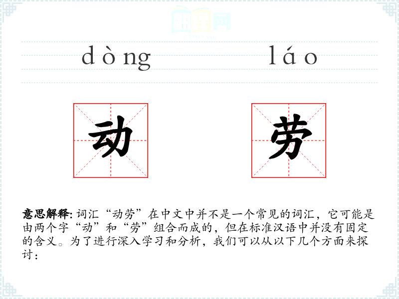 由于“动劳”不是一个标准词汇,我们可以将其拆分为两个字来理解: