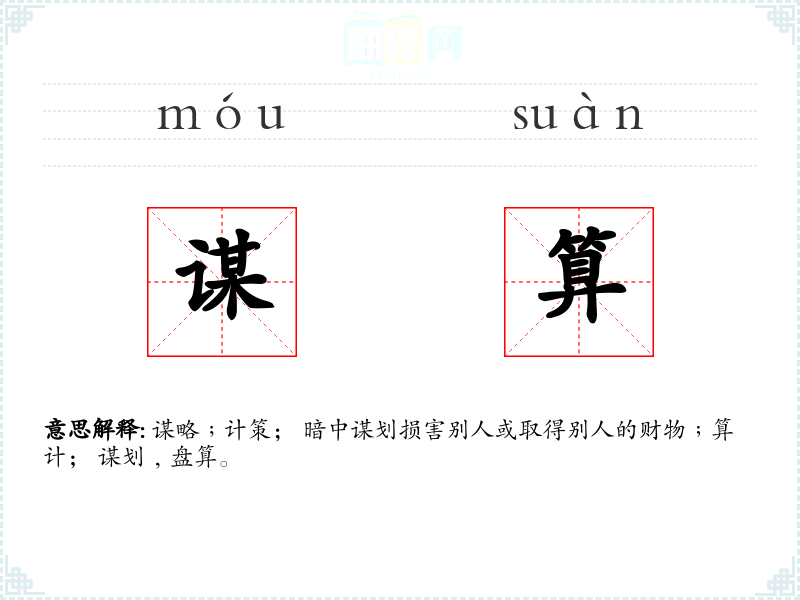 谋略﹔计策; 暗中谋划损害别人或取得别人的财物﹔算计; 谋划﹐盘算。
