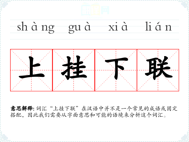 词汇“上挂下联”在汉语中并不是一个常见的成语或固定搭配,因此我们需要从字面意思和可能的语境来分析这个词汇。
