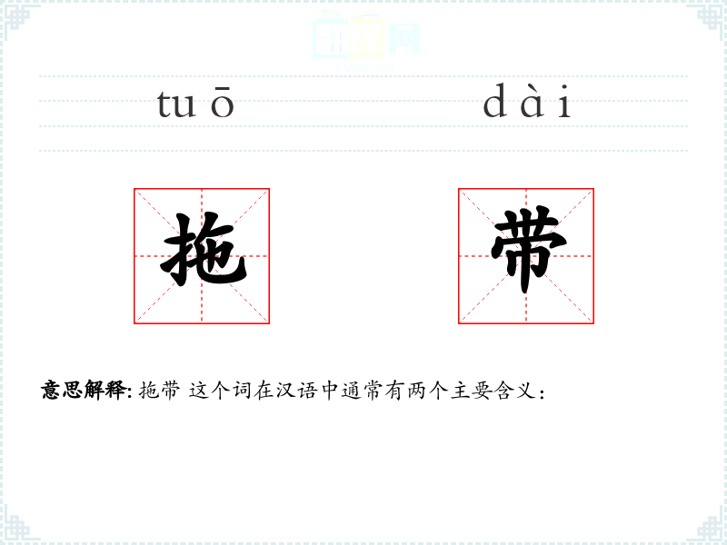 - 专业领域:在物流或工程领域,“拖带”可能特指拖车或拖运设备的操作。