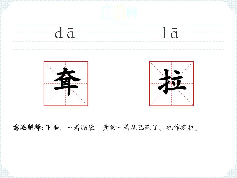 下垂:~着脑袋|黄狗~着尾巴跑了。也作搭拉。