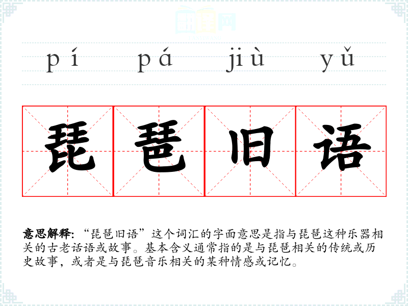 “琵琶旧语”这个词汇的字面意思是指与琵琶这种乐器相关的古老话语或故事。基本含义通常指的是与琵琶相关的传统或历史故事,或者是与琵琶音乐相关的某种情感或记忆。