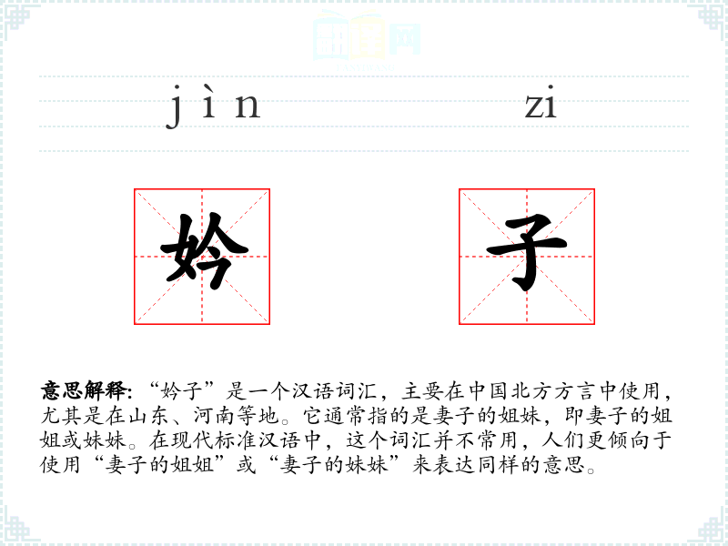 “妗子”是一个汉语词汇,主要在**北方方言中使用,尤其是在山东、河南等地。它通常指的是妻子的姐妹,即妻子的姐姐或妹妹。在现代标准汉语中,这个词汇并不常用,人们更倾向于使用“妻子的姐姐”或“妻子的妹妹”来表达同样的意思。
