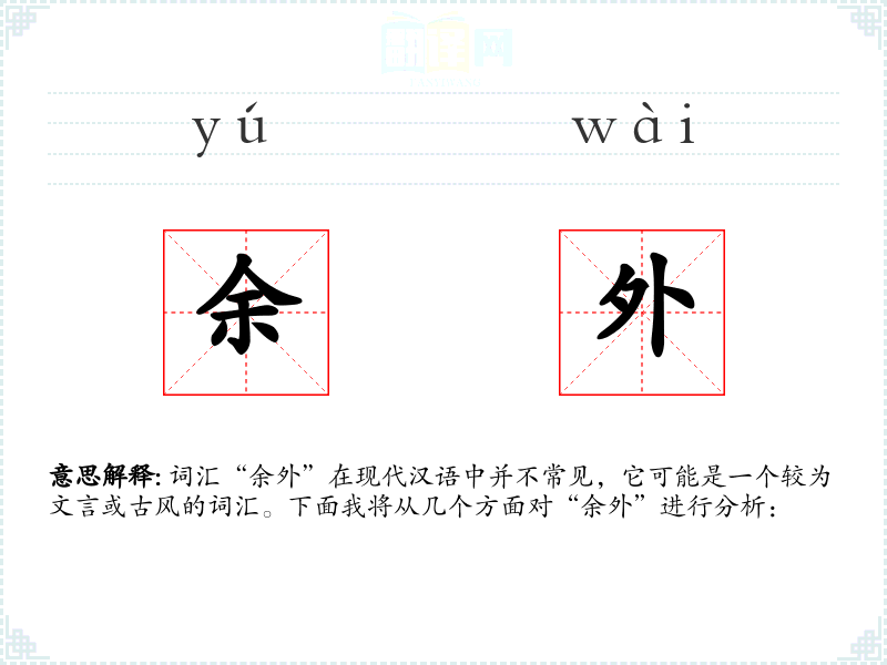 词汇“余外”在现代汉语中并不常见,它可能是一个较为文言或古风的词汇。下面我将从几个方面对“余外”进行分析: