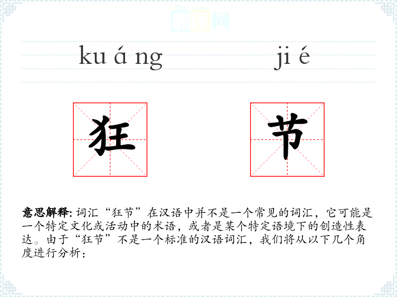 “狂节”字面意思可能指的是一个疯狂的节日或庆典,其中“狂”表示极端或过度,“节”则指节日或庆典。这个词汇可能用来描述一个充满狂欢、放纵或非传统活动的节日。