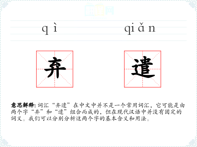 词汇“弃遣”在中文中并不是一个常用词汇,它可能是由两个字“弃”和“遣”组合而成的,但在现代汉语中并没有固定的词义。我们可以分别分析这两个字的基本含义和用法。