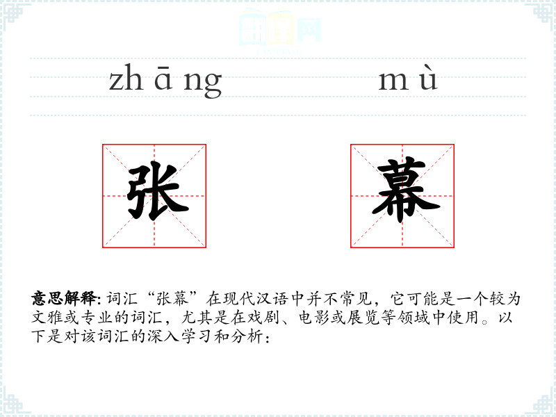 词汇“张幕”在现代汉语中并不常见,它可能是一个较为文雅或专业的词汇,尤其是在戏剧、电影或展览等领域中使用。以下是对该词汇的深入学*和分析: