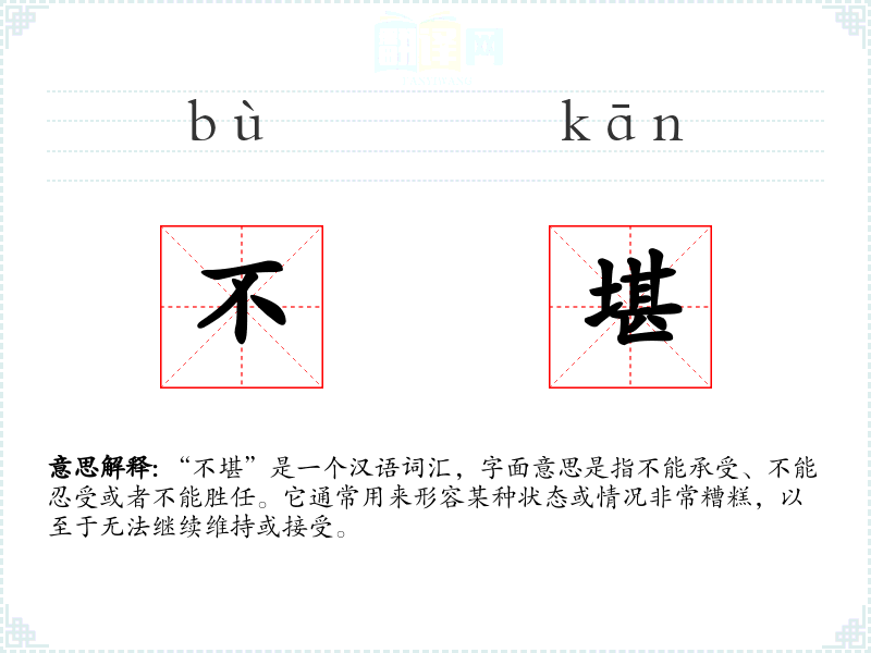 “不堪”是一个汉语词汇,字面意思是指不能承受、不能忍受或者不能胜任。它通常用来形容某种状态或情况非常糟糕,以至于无法继续维持或接受。