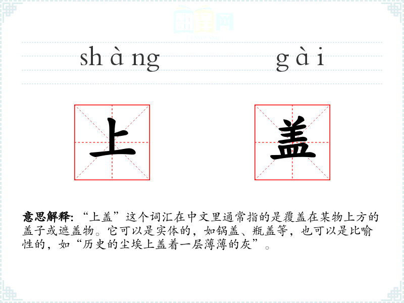 “上盖”这个词汇的词源较为直接,由“上”和“盖”两个字组成,分别表示“上方”和“覆盖”。在古代文献中,这个词汇就已经存在,主要用于描述具体的覆盖物。