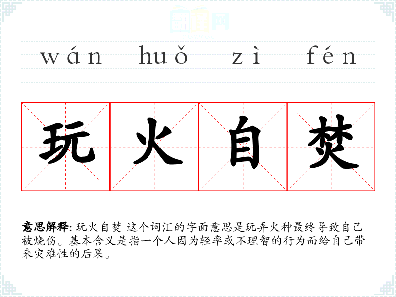 玩火自焚 这个词汇的字面意思是玩弄火种最终导致自己被烧伤。基本含义是指一个人因为轻率或不理智的行为而给自己带来灾难性的后果。
