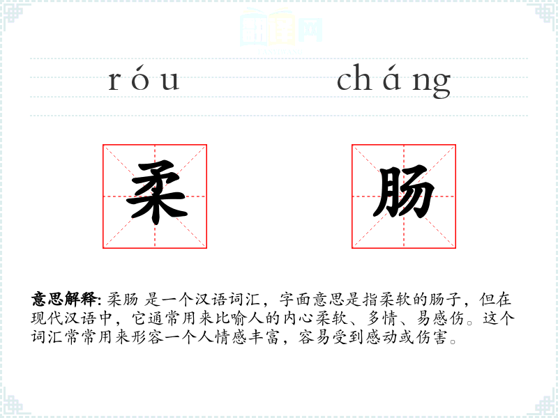 柔肠 是一个汉语词汇,字面意思是指柔软的肠子,但在现代汉语中,它通常用来比喻人的内心柔软、多情、易感伤。这个词汇常常用来形容一个人情感丰富,容易受到感动或伤害。