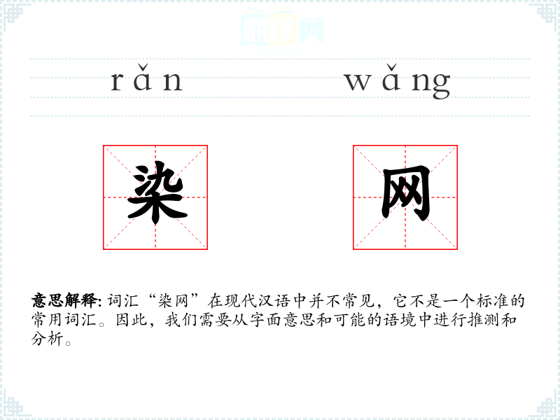 词汇“染网”在现代汉语中并不常见,它不是一个标准的常用词汇。因此,我们需要从字面意思和可能的语境中进行推测和分析。