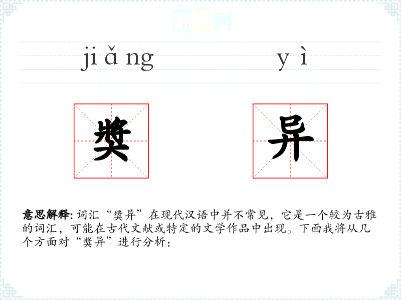词汇“奬异”在现代汉语中并不常见,它是一个较为古雅的词汇,可能在古代文献或特定的文学作品中出现。下面我将从几个方面对“奬异”进行分析: