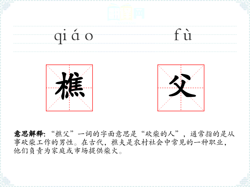 “樵父”一词的字面意思是“砍柴的人”,通常指的是从事砍柴工作的男性。在古代,樵夫是农村社会中常见的一种职业,他们负责为家庭或市场提供柴火。