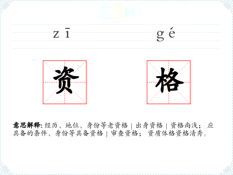 经历、地位、身份等老资格|出身资格|资格尚浅; 应具备的条件、身份等具备资格|审查资格; 资质体格资格清秀。