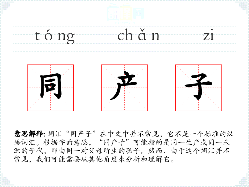 由于“同产子”不是一个常用词汇,其词源和历史演变的信息可能有限。它可能是由“同”(相同)和“产子”(生孩子)两个词组合而成的。