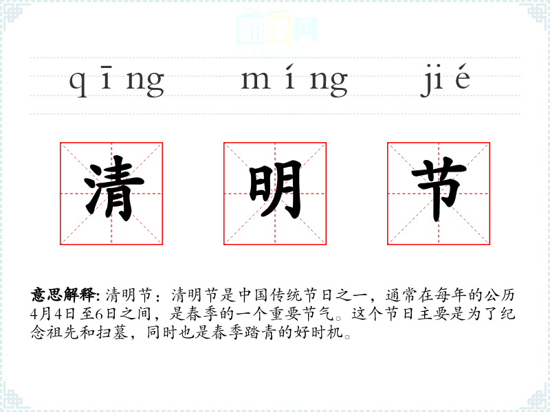 清明节作为一个融合了自然节气、家族传统和文化情感的节日,对我来说,它不仅是缅怀先人的时刻,也是思考生命、家族和社会关系的重要节点。在语言学*和表达中,理解和运用清明节这一词汇,能够丰富我的文化视野和情感表达。