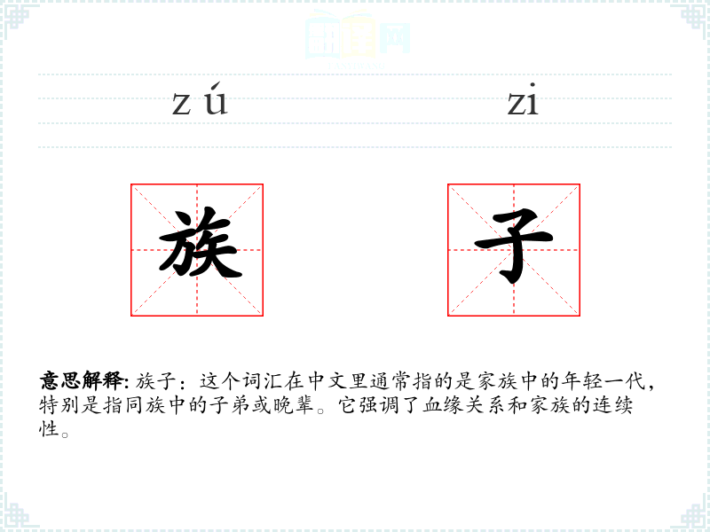 族子:这个词汇在中文里通常指的是家族中的年轻一代,特别是指同族中的子弟或晚辈。它强调了血缘关系和家族的连续性。