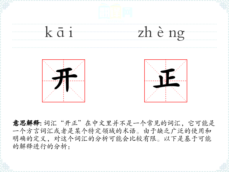 词汇“开正”在中文里并不是一个常见的词汇,它可能是一个方言词汇或者是某个特定领域的术语。由于缺乏广泛的使用和明确的定义,对这个词汇的分析可能会比较有限。以下是基于可能的解释进行的分析: